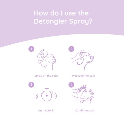 Sprühen Sie auf das trockene Fell oder tragen Sie es nach dem Waschen Ihres Hundes mit dem Greenfields Silky Coat Shampoo auf. Das Produkt ins Fell einmassieren und ca. 1 Minute einwirken lassen. Dann kämmen Sie das Fell, ohne es auszuspülen.