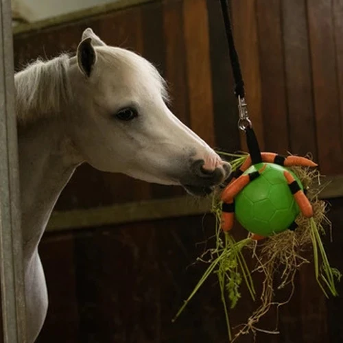 Ob Sie den Ball im Stall oder auf der Wiese (über die obere Schlaufe) aufhängen möchten – alles ist möglich! Die angebrachten Gummibänder erleichtern auch die Befestigung von Heu, Gras oder Snacks. Die Schlaufe macht es auch sehr einfach, den Ball aufzuheben. Garantierter Spielspaß!